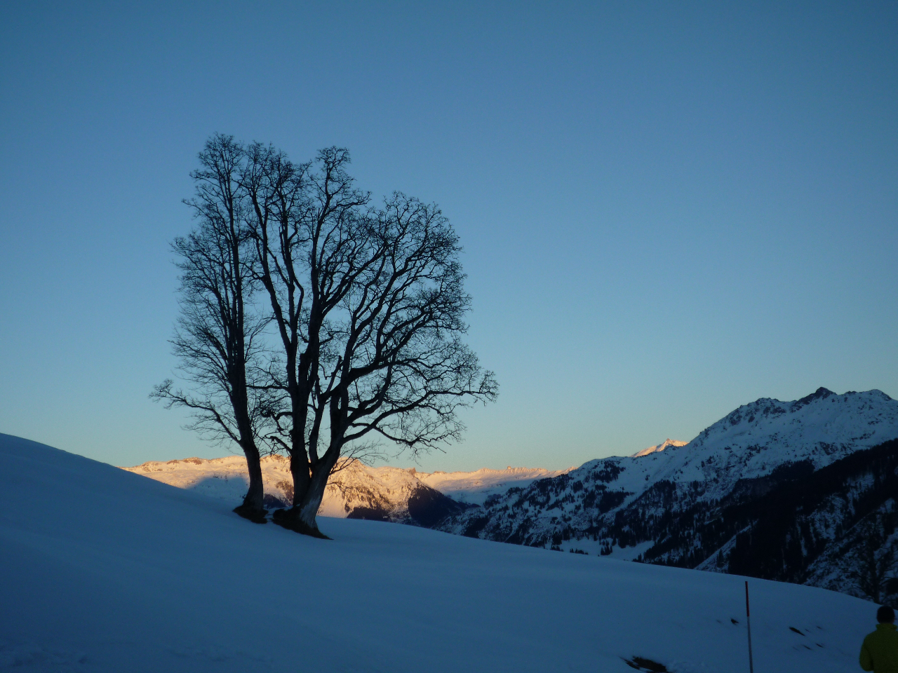 Sensationell! Das Gipfelerlebnis geniessen und gleichzeitig in der Abenddämmerung die glitzernden Lichter in den Tälern beobachten. Wie ein leuchtender Tazzelwurm ziehen sich die Autos und Züge dem Rhein entlang. Auf dieser leichten Tour sind keine Kenntnisse nötig, auch geeignet für Anfänger. Wir ziehen gemütlich durch Schneefelder, durch den verschneiten Wald und sanft geneigte Hänge lassen den Alltag hinter uns. Wir bestimmen die Tierspuren. Die Wildtiere werden es zu schätzen wissen, wenn wir öfters ganz ruhig sind. Wir lauschen ganz bewusst die Stille rundum und geniessen. Sie trägt ohne zu wissen warum. Alles schweingt um uns ohne zu tönen. Es beruhigt, ohne sich bemerkbar zu machen. Wer hat nun etwas gegen einen Beizlibesuch mit einem feinen Fondue?